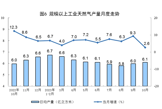 天然氣生產(chǎn)保持平穩(wěn),進口增速加快。10月份,生產(chǎn)天然氣190億立方米,同比增長2.6%,增速比9月份回落6.7個百分點,日均產(chǎn)量6.1億立方米。進口天然氣879萬噸,同比增長15.5%,增速比9月份加快15.1個百分點。