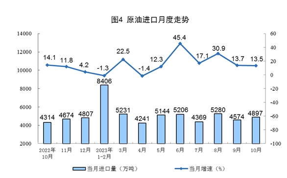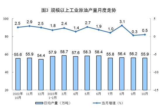 原油生產(chǎn)增速略有加快,進口保持較快增長。10月份,生產(chǎn)原油1733萬噸,同比增長0.5%,增速比9月份加快0.2個百分點,日均產(chǎn)量55.9萬噸。進口原油4897萬噸,同比增長13.5%,增速比9月份放緩0.2個百分點。