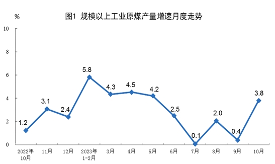 一、原煤、原油和天然氣生產(chǎn)及相關(guān)情況 原煤生產(chǎn)增速加快,進口較快增長。10月份,生產(chǎn)原煤3.9億噸,同比增長3.8%,增速比9月份加快3.4個百分點,日均產(chǎn)量1254.0萬噸。進口煤炭3599萬噸,同比增長23.3%,增速比9月份回落4.5個百分點。