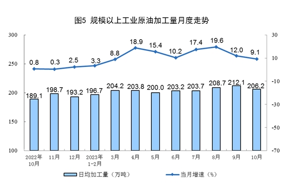 原油加工保持穩(wěn)定增長。10月份,加工原油6393萬噸,同比增長9.1%,增速比9月份放緩2.9個百分點,日均加工原油206.2萬噸。1—10月份,加工原油61876萬噸,同比增長11.2%。