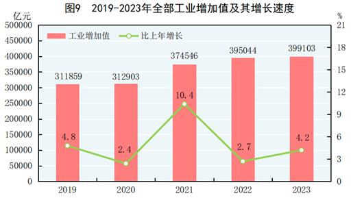 在工業(yè)和建筑業(yè)方面,全年全部工業(yè)增加值399103億元,比上年增長(zhǎng)4.2%。規(guī)模以上工業(yè)增加值增長(zhǎng)4.6%。在規(guī)模以上工業(yè)中,分經(jīng)濟(jì)類型看,國有控股企業(yè)增加值增長(zhǎng)5.0%;股份制企業(yè)增長(zhǎng)5.3%,外商及港澳臺(tái)商投資企業(yè)增長(zhǎng)1.4%;私營企業(yè)增長(zhǎng)3.1%。分門類看,采礦業(yè)增長(zhǎng)2.3%,制造業(yè)增長(zhǎng)5.0%,電力、熱力、燃?xì)饧八a(chǎn)和供應(yīng)業(yè)增長(zhǎng)4.3%。