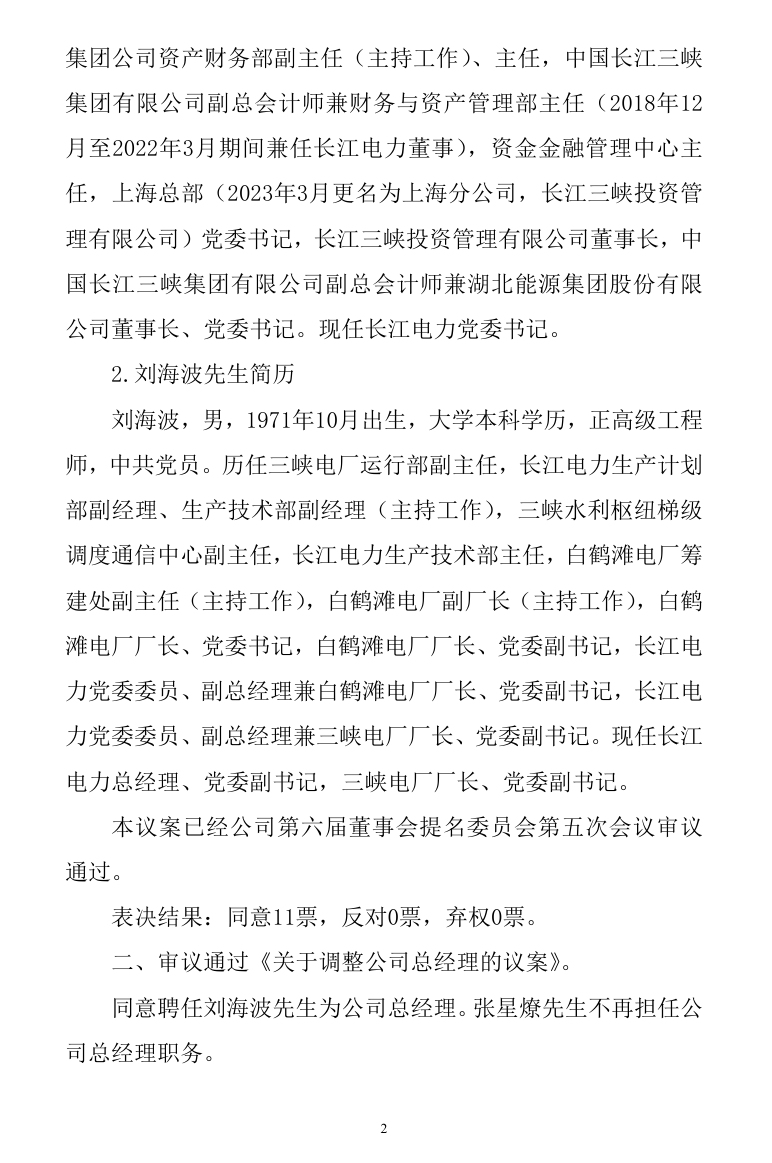 根據(jù)《公司法》《公司章程》等有關(guān)規(guī)定,經(jīng)公司控股股東中國長江三峽集團有限公司推薦、董事會提名委員會審核,董事會同意提名劉姿女士為公司董事候選人,任期自股東大會審議通過之日起至第二屆董事會任期屆滿之日止;該事項尚需提交公司股東大會審議。經(jīng)公司董事長提名、董事會提名委員會審核,董事會同意聘任劉姿女士為公司總經(jīng)理,任期自本次董事會審議通過之日起至第二屆董事會任期屆滿之日止。