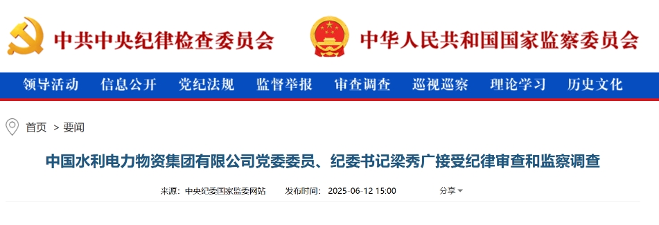 中央紀委國家監(jiān)委網站6月12日消息,據中央紀委國家監(jiān)委駐中國大唐紀檢監(jiān)察組、江蘇省紀委監(jiān)委消息:中國水利電力物資集團有限公司黨委委員、紀委書記梁秀廣涉嫌嚴重違紀違法,目前正接受中央紀委國家監(jiān)委駐中國大唐紀檢監(jiān)察組紀律審查和江蘇省鎮(zhèn)江市監(jiān)察委員會監(jiān)察調查。