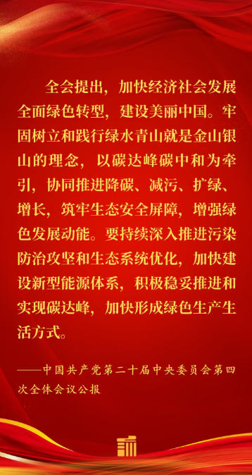全會提出,加快經(jīng)濟(jì)社會發(fā)展全面綠色轉(zhuǎn)型,建設(shè)美麗中國。牢固樹立和踐行綠水青山就是金山銀山的理念,以碳達(dá)峰碳中和為牽引,協(xié)同推進(jìn)降碳、減污、擴(kuò)綠、增長,筑牢生態(tài)安全屏障,增強(qiáng)綠色發(fā)展動能。要持續(xù)深入推進(jìn)污染防治攻堅和生態(tài)系統(tǒng)優(yōu)化,加快建設(shè)新型能源體系,積極穩(wěn)妥推進(jìn)和實現(xiàn)碳達(dá)峰,加快形成綠色生產(chǎn)生活方式。