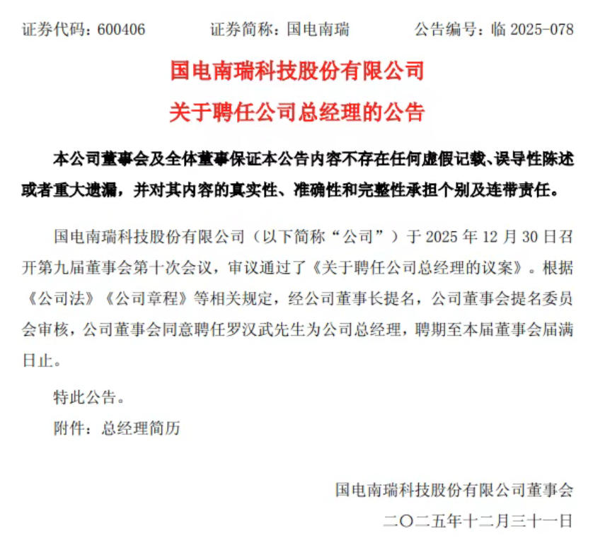12月31日,國(guó)電南瑞發(fā)布公告,國(guó)電南瑞科技股份有限公司于2025年12月30日召開(kāi)第九屆董事會(huì)第十次會(huì)議,審議通過(guò)了《關(guān)于聘任公司總經(jīng)理的議案》。根據(jù)《公司法》《公司章程》等相關(guān)規(guī)定,經(jīng)公司董事長(zhǎng)提名,公司董事會(huì)提名委員會(huì)審核,公司董事會(huì)同意聘任羅漢武先生為公司總經(jīng)理,聘期至本屆董事會(huì)屆滿(mǎn)日止。