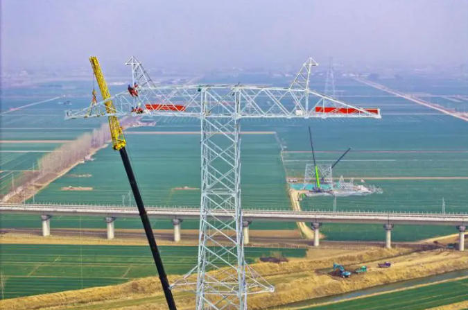 ▲國網(wǎng)湖北襄陽供電公司員工在220千伏楚襄線開展立塔作業(yè),為鋰電池新能源項(xiàng)目建成提供電力保障