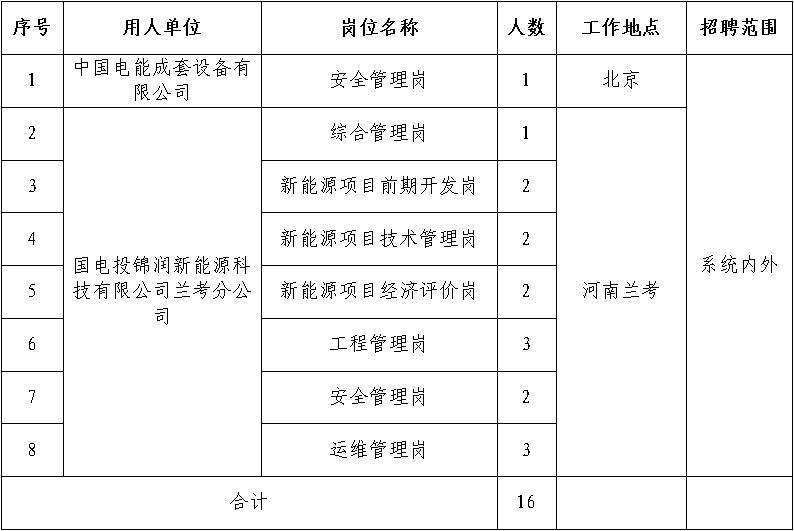 為加快推進(jìn)公司新興產(chǎn)業(yè)落地,保障各項(xiàng)經(jīng)營(yíng)管理工作有序開(kāi)展,根據(jù)相關(guān)所屬企業(yè)用人實(shí)際,面向國(guó)家電投集團(tuán)系統(tǒng)內(nèi)、外公開(kāi)選聘專(zhuān)業(yè)技術(shù)人員共16名?,F(xiàn)將有關(guān)事項(xiàng)公告如下:
