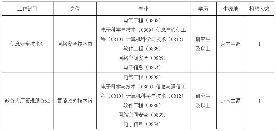 1.信息安全技術處:網絡安全技術崗工作人員1名(京內生源研究生及以上應屆畢業(yè)生)。專業(yè)為電氣工程(0808)、電子科學與技術(0809)、信息與通信工程(0810)、計算機科學與技術(0812)、軟件工程(0835)、網絡空間安全(0839)、電子信息(0854)。要求熟悉網絡安全和數(shù)據(jù)安全防護技術、法律法規(guī)和管理知識,作風正派、嚴謹細致、踏實肯干,責任心強、執(zhí)行力強、服務意識強,具有較強的溝通協(xié)調能力和文字功底。