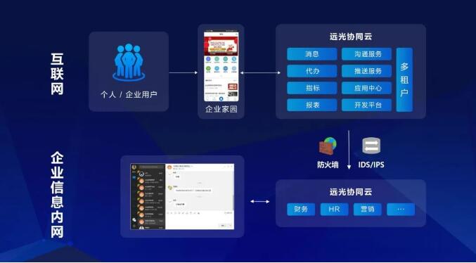 遠(yuǎn)光“企業(yè)家園”采用公有云與私有云共存的混合云架構(gòu),即對于企業(yè)商密等級較低的數(shù)據(jù),如消息提醒、待辦提醒等可以通過移動端在外網(wǎng)進(jìn)行實(shí)時(shí)訪問,對于企業(yè)內(nèi)部數(shù)據(jù)、商密等級高的數(shù)據(jù),依然保留在本地,通過企業(yè)電腦端才能訪問。充分利用互聯(lián)網(wǎng)應(yīng)用的靈活性、便利性的同時(shí),保證數(shù)據(jù)的安全性、私密性。