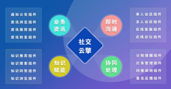 遠光社交云擎套件,含即時溝通、知識賦能、業(yè)務資訊、協同處理四大云擎組件,所有組件能夠與企業(yè)各類業(yè)務系統深度融合,以人為核心,以高效協同為根本,改變企業(yè)及組織傳統的互動與信息共享方式,破解業(yè)務協同互聯等難題,實現管理系統融合創(chuàng)新,助力管理快速社交化、智能化升級。