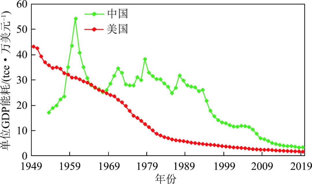 美國能源消費碳排放強度在碳達峰前期、達峰期下降幅度較小,實現(xiàn)碳達峰核心是提高能源效率,降低單位GDP能耗,在不大幅度增加能源消費的前提下,支撐經(jīng)濟增長。2019年美國單位GDP能耗僅相當(dāng)于1949年的3.9%。