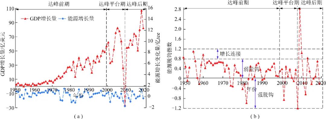 研究人員根據(jù)現(xiàn)代化進程、能源消費和碳排放趨勢,將美國碳排放分三個階段:即碳達峰前期(1949—1999年)、碳達峰平臺期(2000—2008年)、碳達峰后期(2009年至今)。依據(jù)Tapio彈性分析法對美國能源消耗與GDP增長的脫鉤程度進行定量分析后,得到如下認(rèn)識: