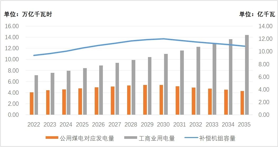 圖1 公用煤電對應(yīng)發(fā)電量及工商業(yè)用電量、補償機組容量預(yù)測趨勢(未來年度數(shù)據(jù)為作者個人分析預(yù)測值,其中煤電容量數(shù)據(jù)為年內(nèi)平均值而非期末時點值)