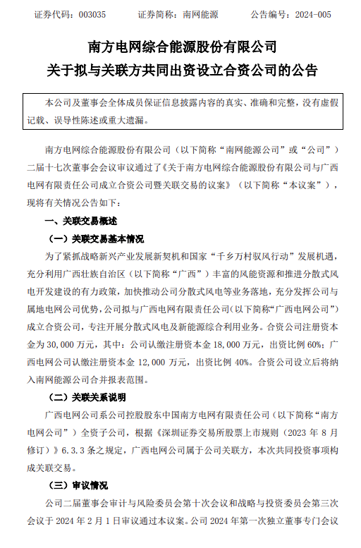 2月7日,南方電網(wǎng)綜合能源股份有限公司發(fā)布公告稱,擬與廣西電網(wǎng)有限責任公司(下稱“廣西電網(wǎng)”)成立合資公司廣西綜合能源有限公司,專注開展分散式風電及新能源綜合利用業(yè)務(wù)。