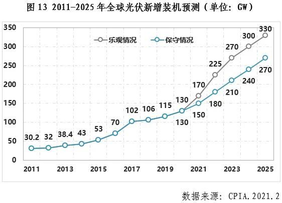 (二)我國光伏市場將進(jìn)入快速發(fā)展新階段2021年是“十四五”規(guī)劃的開局之年,也是我國光伏發(fā)電進(jìn)入平價上網(wǎng)的關(guān)鍵之年。2021年我國光伏應(yīng)用市場將繼續(xù)保持快速增長勢頭,預(yù)計新增裝機(jī)規(guī)模可達(dá)55-65GW,其中競價結(jié)轉(zhuǎn)項目10GW左右,戶用市場有望達(dá)到15GW,工商業(yè)分布式預(yù)計在10GW左右,外送及平價地面電站在20-30GW左右。在“碳達(dá)峰、碳中和”目標(biāo)下, “十四五”期間我國光伏市場將迎來市場化建設(shè)高峰,預(yù)計國內(nèi)年均光伏裝機(jī)新增規(guī)模在70-90GW,有望進(jìn)一步加速我國能源轉(zhuǎn)型。