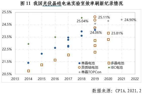 實驗室方面,2020年4月,晶科研發(fā)的多晶硅(Multicrystalline)電池片實驗室效率達(dá)到23.3%,并被收錄于NREL電池片轉(zhuǎn)換效率紀(jì)錄表中,隨后阿特斯宣布將該效率提高至23.81%。7月,晶科宣布其研發(fā)的N型單晶硅單結(jié)電池片效率達(dá)到24.79%,2021年1月,將該紀(jì)錄再次刷新到24.90%,創(chuàng)造了新的大面積N型單晶鈍化接觸電池片效率世界紀(jì)錄。我國除了在晶硅電池技術(shù)方面領(lǐng)先全球外,鈣鈦礦、有機(jī)電池等電池片實驗室效率也走在世界前列,2020年7月,杭州纖納光電以18.04%的鈣鈦礦小組件光電轉(zhuǎn)換效率的成績,第七次蟬聯(lián)了鈣鈦礦小組件世界紀(jì)錄榜首。目前NREL電池片轉(zhuǎn)換效率紀(jì)錄表中,除晶科的多晶硅電池片外,上海交大/北航、中科院化學(xué)所和漢能分別研發(fā)的有機(jī)電池、有機(jī)疊層電池和薄膜電池仍保持著世界紀(jì)錄。
