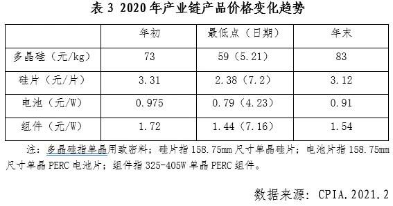 (四)產(chǎn)業(yè)鏈供給矛盾突出2020年,光伏產(chǎn)品價格經(jīng)歷了V字型起伏的過程,光伏產(chǎn)業(yè)硅料、玻璃和EVA膠膜等部分原輔材料環(huán)節(jié)出現(xiàn)的供需緊張也前所未有。上半年,受全球疫情蔓延影響,對下游應(yīng)用市場未來需求的不確定性導(dǎo)致產(chǎn)業(yè)鏈大幅降價,各環(huán)節(jié)價格降幅均在20%左右。硅料環(huán)節(jié),三季度受到事故及自然災(zāi)害等因素影響供應(yīng)緊張,8月多晶硅致密料價格由6月的59元/公斤增加至約95元/公斤,漲幅約為60%;四季度隨著新疆地區(qū)硅料企業(yè)復(fù)工,多晶硅價格回落,但仍高于二季度價格低點38%。EVA膠膜的生產(chǎn)設(shè)備及原材料EVA粒子可用于防疫物資生產(chǎn),2020年防疫物資需求暴漲,使得生產(chǎn)設(shè)備及EVA粒子供應(yīng)緊張,膠膜企業(yè)擴(kuò)產(chǎn)受阻延遲,在下半年需求暴漲的情況下,EVA膠膜企業(yè)只能通過大幅漲價的方式來獲取EVA粒子資源。下半年EVA膠膜價格上漲了50%,一度達(dá)到14元/平方米的高價,和POE膠膜的價格形成了倒掛。下半年需求的集中爆發(fā)導(dǎo)致光伏玻璃供給出現(xiàn)巨大缺口,價格快速上漲,年底3.2mm光伏玻璃價格達(dá)到了43元/平方米,較5-6月最低時上漲80%,部分企業(yè)采用浮法玻璃作為雙面組件的背板玻璃。進(jìn)入12月,產(chǎn)品價格趨于平緩。但全年來看,除多晶硅價格上漲13.7%以外,硅片、電池、組件產(chǎn)品價格仍分別下降了5.7%、6.7%與10.5%,降本增效發(fā)展方向沒有變,長期來看價格依然是下降趨勢。