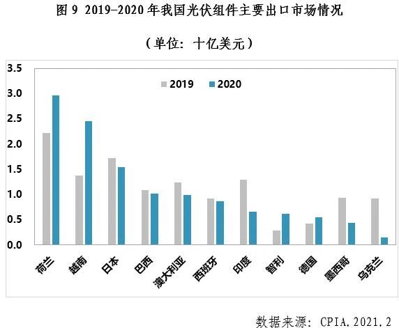 從光伏組件出口市場來看,2020年光伏組件主要出口市場中傳統(tǒng)市場活力不減,其中荷蘭和越南市場份額增長明顯。在光伏發(fā)電成本持續(xù)降低以及歐盟綠色協(xié)議的背景下,歐洲市場保持增長勢頭,荷蘭作為歐洲市場的集散中心出口量持續(xù)增長。越南新一輪FIT政策引發(fā)了越南屋頂光伏的搶裝熱潮,根據(jù)越南工貿(mào)部的公告顯示,2020年越南光伏新增裝機(jī)為10.75GW,成為全球前3大光伏市場,其中屋頂光伏裝機(jī)超過9GW。越南市場新增裝機(jī)猛增,對我國組件需求明顯增長,成為第二大光伏組件出口市場。印度市場受疫情影響,市場需求下降較為明顯。曾經(jīng)的新興市場烏克蘭因其國內(nèi)電價的下降致使光伏項目的收益有所降低,投資熱情減退,市場需求下降。墨西哥市場受到清潔能源拍賣的取消以及后續(xù)政策不確定性的影響未能延續(xù)之前的增長勢頭,市場需求有所下降。