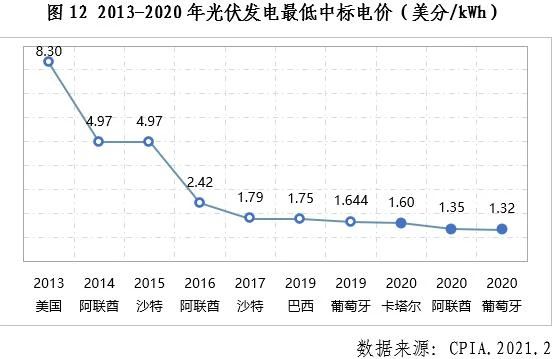(五)光伏發(fā)電電價與成本持續(xù)下降2020年,全球光伏發(fā)電中標(biāo)電價繼續(xù)下降,僅一年中全球就有三個項目接連創(chuàng)造了最低中標(biāo)電價。8月,位于葡萄牙一光伏項目中標(biāo)電價達(dá)到了0.0112歐元/kWh(約1.32美分/kWh),折合當(dāng)時人民幣價格約0.091元/kWh。這一電價比2019年最低中標(biāo)電價降低了0.324美分/kWh,降幅達(dá)到19.7%。2020年,我國光伏發(fā)電項目中標(biāo)電價也刷新最低紀(jì)錄,青海海南州一光伏發(fā)電競價項目中標(biāo)電價為0.2427元/kWh(約3.46美分/kWh),低于2019年達(dá)拉特旗光伏項目0.26元/kWh的電價。除此之外,卡塔爾、阿聯(lián)酋、印度等國光伏中標(biāo)電價也打破了原來的最低紀(jì)錄。光伏發(fā)電價格已經(jīng)在全球越來越多的國家及地區(qū)低于火電,成為了最具競爭力的電力產(chǎn)品。