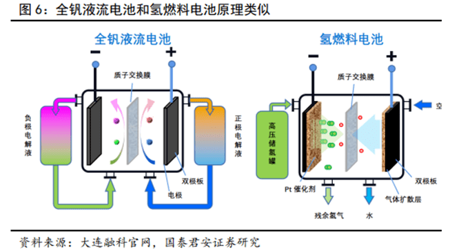 全釩液流電池與氫燃料電池結(jié)構(gòu)與原理類似,電堆是系統(tǒng)的核心部件,是發(fā)生電化學(xué)反應(yīng)和產(chǎn)生電能的場所,電解液或氫氣儲存在外部儲罐中。