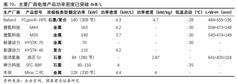 石墨板適應需求趨于薄型化,乘用車為金屬板帶來機遇。石墨板:由于其高耐腐蝕性、高耐久性,以及相對較低的技術壁壘,率先實現(xiàn)國產(chǎn)化,在對體積較不敏感而對耐久性敏感的特種車、商用車領域示范應用。然而,石墨雙極板的制作周期長、機械性能差、加工難度大、制作成本高等劣勢也不可忽視。市場已有越來越多的企業(yè)成功開發(fā)出超薄超精細石墨雙極板,提前突破了國家制定2025年前單組石墨雙極板厚度1.5mm的要求,功率密度開始接近豐田第一代金屬雙極板的水平。金屬板:抗腐蝕性差,壽命過短是其應用的阻礙,然而隨著涂層工藝的持續(xù)進步與突破,其有望實現(xiàn)和石墨板相同的使用壽命。豐田汽車公司率先在旗下Mirai燃料電池汽車上使用金屬雙極板和涂層,解決了腐蝕、成本和導電等一系列問題。憑借其機械性能優(yōu)異、高體積功率密度、成本低廉且易批量生產(chǎn)等優(yōu)勢,金屬雙極板將在乘用車規(guī)?;瘧玫倪M程中實現(xiàn)突破。