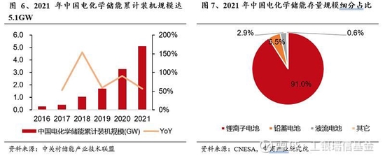 我國電化學儲能裝機規(guī)模持續(xù)高速增長,其中鋰電池儲能規(guī)模占比超九成。2021年,中國電化學儲能累計裝機規(guī)模5.1GW,同比增長56.5%,2016-2021年CAGR高達79.3%。其中,鋰離子電池儲能技術裝機規(guī)模4.7GW,裝機規(guī)模占比91.0%;鉛蓄電池儲能裝機規(guī)模0.3GW,占比5.5%;液流電池儲能技術裝機規(guī)模0.1GW,占比2.9%。