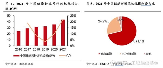 我國儲能市場穩(wěn)步擴容,電化學儲能份額增長明顯。在新能源發(fā)電規(guī)模大幅增長的推動下,我國儲能裝機規(guī)模一直保持高速增長的趨勢。根據(jù)國家能源局數(shù)據(jù),2021年中國儲能市場累計裝機功率位居全球第一,為43.4GW,同比增長21.9%,2016-2021年儲能累計裝機量年均復合增長率為12.3%。2021年我國抽水蓄能新增裝機5.2GW,占比71.1%;電化學儲能新增裝機1.8GW,占比24.9%,較2020年占比9.2%增幅較大,電化學儲能市場份額增長明顯。