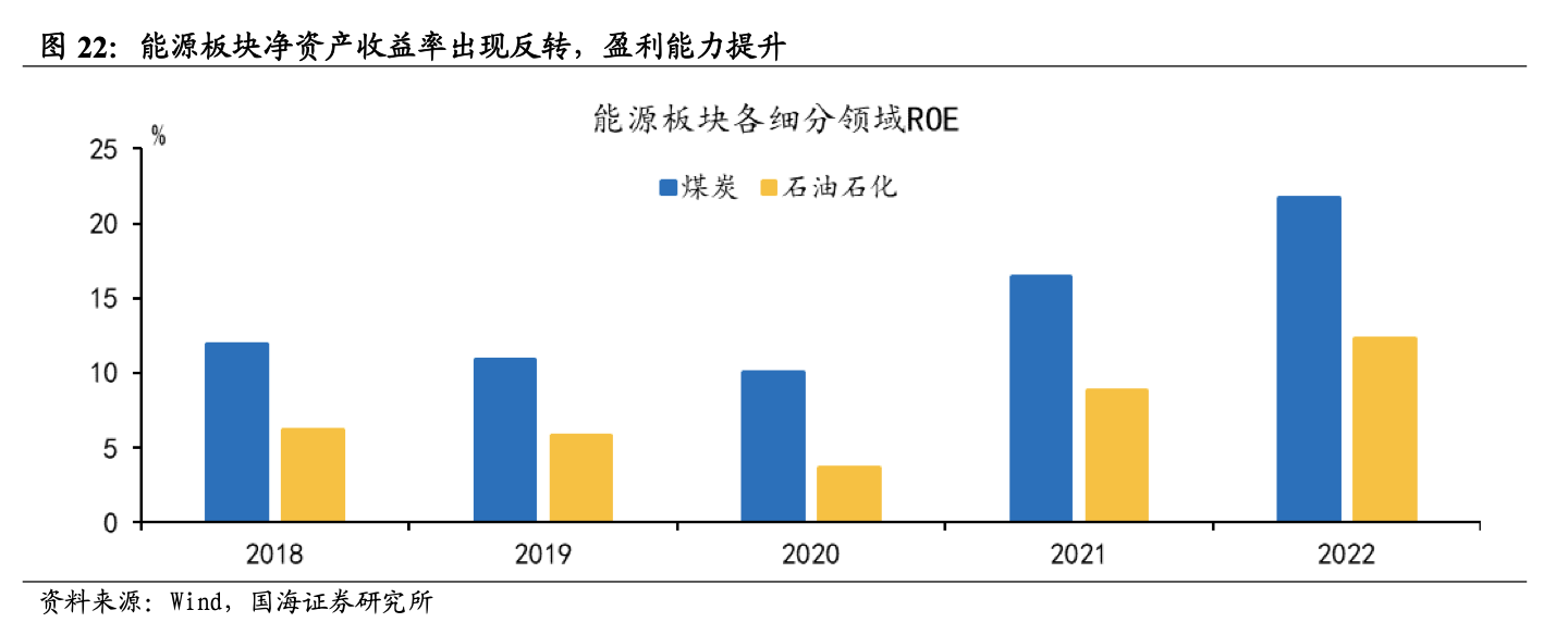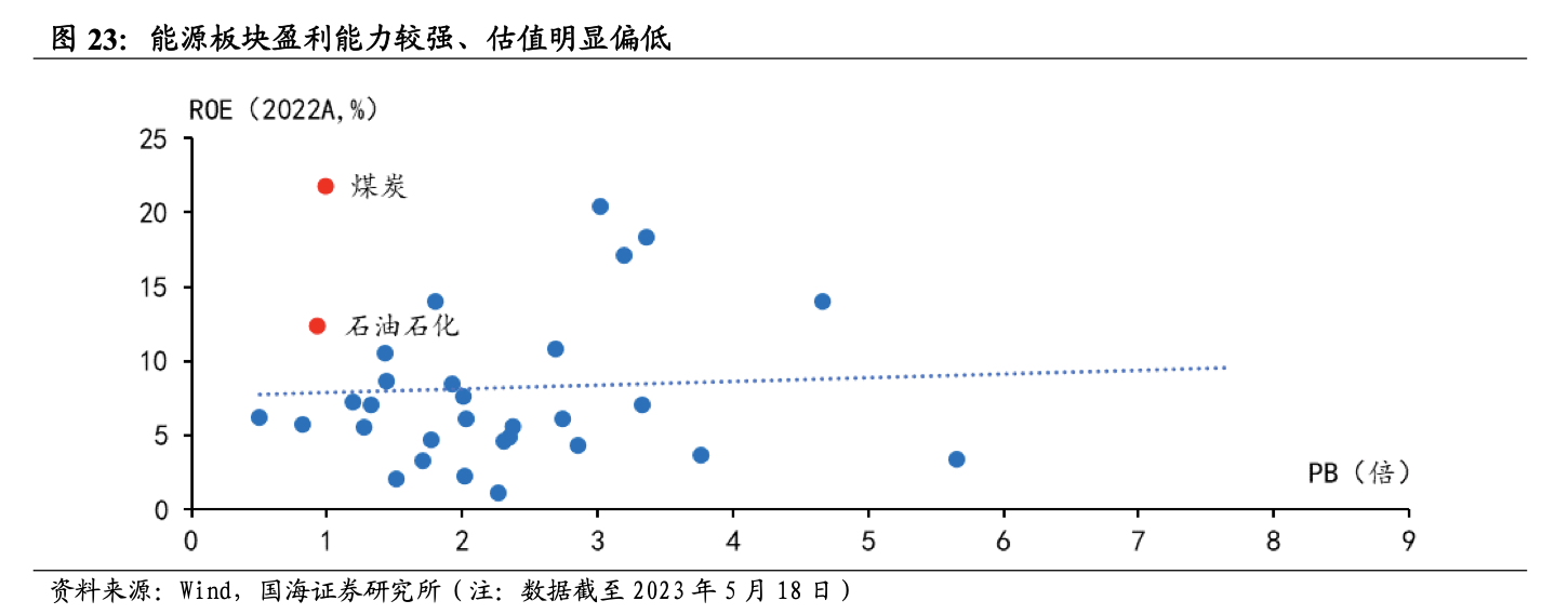 國海證券6月8日研報表示,能源板塊中上市公司擁有較為優(yōu)質(zhì)的基本面和偏低的市場估值,處于優(yōu)質(zhì)資產(chǎn)被低估的狀態(tài)。根據(jù)國海證券6月8日研報測算,截止到5月24日,石油石化、煤炭、公用事業(yè)2022年全年的ROE分別為12.32%、21.74%、5.59%,盈利能力較強,且PB十年分位分別為 8.3%、35.9%、37.8%,能源是優(yōu)質(zhì)資產(chǎn)被低估的主要領域,調(diào)整過后仍具備性價比。
