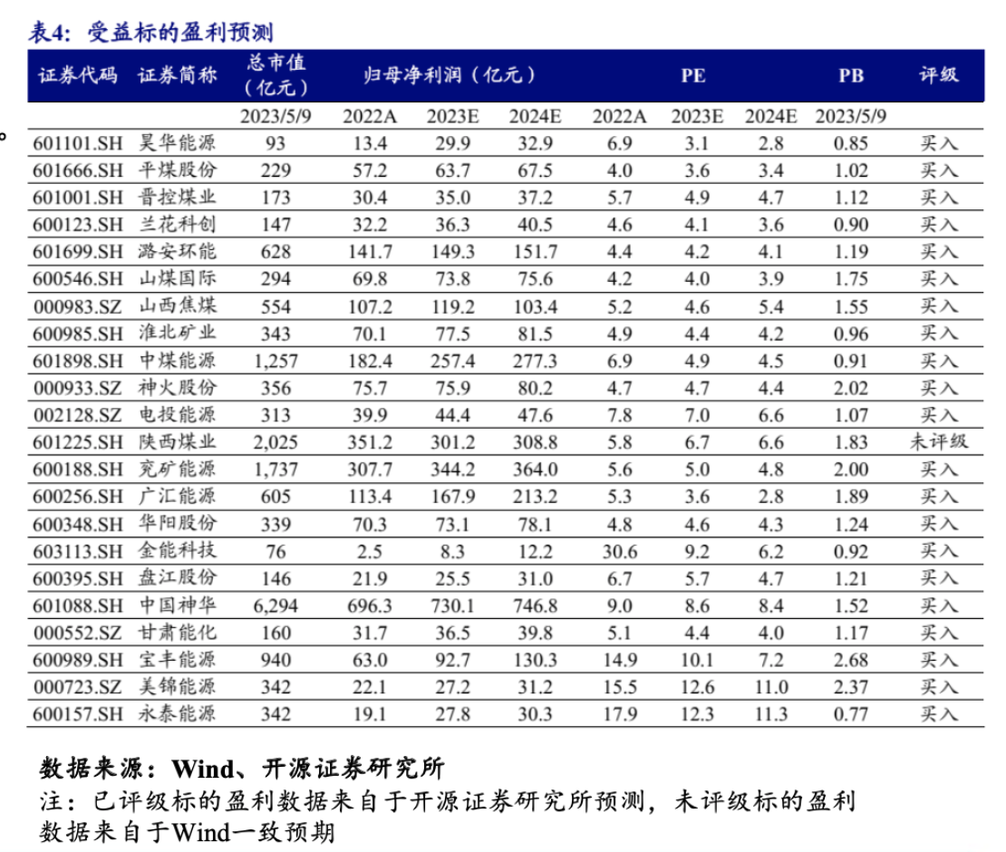 根據(jù)開源證券梳理,煤企四種能源轉(zhuǎn)型途徑分別為,高分紅兼具高彈性的雙重受益標的(前四再疊加高成長):山西焦煤、廣匯能源、兗礦能源、潞安環(huán)能、山煤國際;經(jīng)濟復蘇及冶金煤彈性受益標的:平煤股份、淮北礦業(yè)(含轉(zhuǎn)債)、神火股份(煤鋁);穩(wěn)健高分紅受益標的:中國神華、陜西煤業(yè);中特估預期差最大受益標的:中煤能源;能源轉(zhuǎn)型受益標的:華陽股份、美錦能源(含轉(zhuǎn)債)、電投能源、永泰能源。