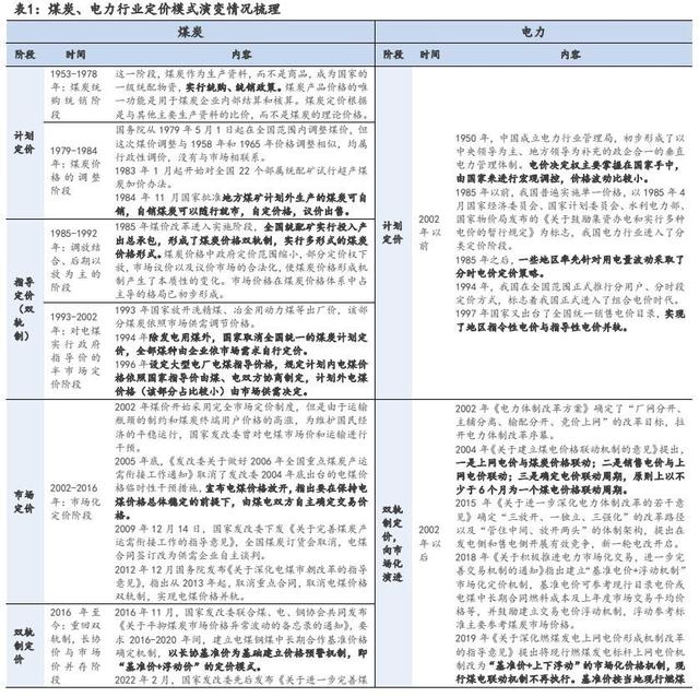 煤電矛盾的本質(zhì)是煤、電定價(jià)機(jī)制市場(chǎng)化程度不同。煤炭定價(jià)方面,2016 年以前我國(guó)煤炭?jī)r(jià)格經(jīng)歷了計(jì)劃價(jià)格、指導(dǎo)價(jià)格、市場(chǎng)價(jià)格等多種定價(jià)機(jī)制。2016 年末國(guó)家發(fā)改委聯(lián)合煤、電、鋼協(xié)會(huì)共同發(fā)布《關(guān)于平抑煤炭市場(chǎng)價(jià)格異常波動(dòng)的備忘錄的通知》,要求 2016-2020 年間,建立電煤鋼煤中長(zhǎng)期合作基準(zhǔn)價(jià)格確定機(jī)制,以長(zhǎng)協(xié)基準(zhǔn)價(jià)為基礎(chǔ)建立價(jià)格預(yù)警機(jī)制,即“基準(zhǔn)價(jià)+浮動(dòng)價(jià)”的定價(jià)模式。電力定價(jià)方面,2015 年國(guó)家開(kāi)啟電力定價(jià)機(jī)制市場(chǎng)化改革,2020 年取消“煤電聯(lián)動(dòng)”機(jī)制,同時(shí)將燃煤發(fā)電標(biāo)桿上網(wǎng)電價(jià)機(jī)制改為“基準(zhǔn)價(jià)+上下浮動(dòng)”的市場(chǎng)化價(jià)格機(jī)制,基準(zhǔn)價(jià)格設(shè)定權(quán)下放至地方政府,浮動(dòng)幅度由電力用戶等市場(chǎng)主體協(xié)商決定。