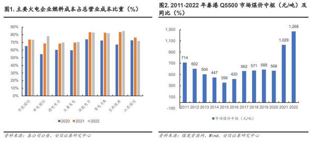 據(jù)煤炭資源網(wǎng),2021 年秦皇島港動(dòng)力煤 Q5500 平倉(cāng)價(jià)中樞達(dá)到 1029 元/噸,較 2020 年價(jià)格中樞 568 元/噸上漲約 81%。2022 年,在俄烏沖突、極端高溫天氣、煤炭新增產(chǎn)能釋放有限等多重因素影響下,煤價(jià)持續(xù)高位運(yùn)行,秦皇島港動(dòng)力混煤 Q5500 平倉(cāng)價(jià)全年價(jià)格中樞抬升至1268 元/噸,同比提高約 23%,直接導(dǎo)致 2021-2022 年火電企業(yè)燃料成本占比大幅提升,火電企業(yè)業(yè)績(jī)承壓。