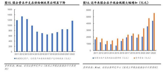 “雙碳”目標(biāo)下,煤企轉(zhuǎn)型具備先天產(chǎn)業(yè)優(yōu)勢(shì)、地域優(yōu)勢(shì)且資金充足。一方面,煤企具有產(chǎn)業(yè)優(yōu)勢(shì),具備能源開(kāi)采、裝備制造的成熟經(jīng)驗(yàn),擁有穩(wěn)定的下游電廠、化工客源,以及先天地域優(yōu)勢(shì)。我國(guó)大型新能源項(xiàng)目基地多數(shù)位于西北地區(qū),與煤炭資源分布重合度較高,如我國(guó)第一批容量約 1 億千瓦的大型風(fēng)電光伏基地主要位于甘肅、青海、內(nèi)蒙、寧夏等西部地區(qū)。此外,與傳統(tǒng)能源相比,新能源占地面積大。隨著新能源規(guī)模快速擴(kuò)大,土地資源已經(jīng)成為影響新能源發(fā)展的重要因素,煤炭企業(yè)可利用自有采煤沉陷區(qū)受損土地規(guī)劃建設(shè)光伏發(fā)電、風(fēng)力發(fā)電等新能源項(xiàng)目,提高資源利用率的同時(shí)還可實(shí)現(xiàn)綠色轉(zhuǎn)型。另一方面,受制于 2011-2013 年行業(yè)產(chǎn)能過(guò)剩以及 2016 年以來(lái)的供給側(cè)結(jié)構(gòu)性改革,煤炭行業(yè)資本開(kāi)支明顯下降,2021 年至今雖在行業(yè)景氣度好轉(zhuǎn)以及政策鼓勵(lì)保供穩(wěn)價(jià)背景下有所回升,但在“雙碳”目標(biāo)持續(xù)推進(jìn)下,煤炭固定資產(chǎn)投資規(guī)模大、時(shí)間長(zhǎng),資本開(kāi)支仍低于此前水平,且新礦井的使用時(shí)間一般長(zhǎng)達(dá)數(shù)十年之久,長(zhǎng)期來(lái)看與雙碳背景相違背,企業(yè)進(jìn)行煤炭固定資產(chǎn)投資的意愿不強(qiáng)。但近兩年煤價(jià)高位運(yùn)行,使得煤炭企業(yè)盈利能力持續(xù)改善,在手現(xiàn)金規(guī)模大幅增加,為后續(xù)轉(zhuǎn)型提供基礎(chǔ)。