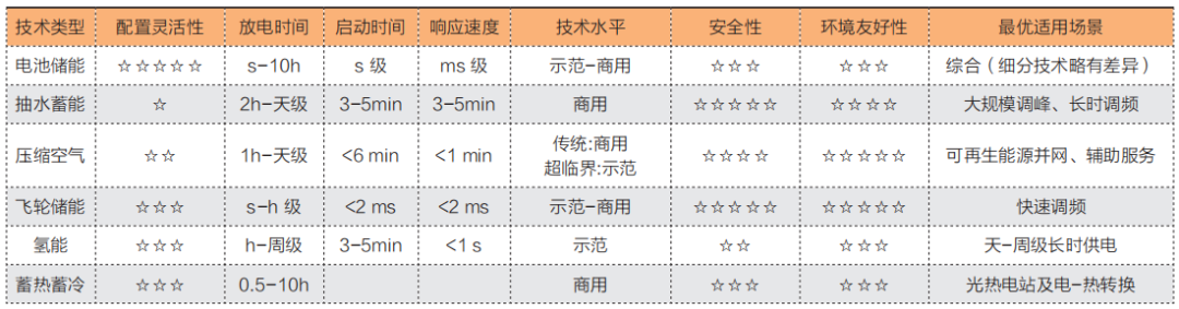 綜合分析各類儲能的技術(shù)特點,從配置靈活性上看,電池儲能配置靈活性及可擴(kuò)展性最為優(yōu)異,抽水蓄能及傳統(tǒng)洞穴式壓縮空氣配置靈活性最差;從儲能發(fā)電時長上看,氫能發(fā)電時間可達(dá)周級,抽水蓄能及傳統(tǒng)洞穴式壓縮空氣次之,電池儲能放電時間基本在s-10h之間;從啟動及響應(yīng)速度上看,飛輪、超級電容和電池儲能技術(shù)基本在ms-s級別,適用于快速響應(yīng)的調(diào)頻領(lǐng)域;從安全性上看,機(jī)械儲能安全性最為優(yōu)異,電化學(xué)儲能的安全性相對較弱。