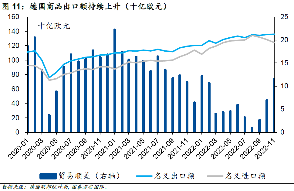 進(jìn)一步看,隨著疫情的相對穩(wěn)定,個人消費(fèi)支出增長4.6%,對GDP增長起到了核心支撐作用。經(jīng)價格調(diào)整后,2022年德國商品出口額和進(jìn)口額比上年分別增長3.2%和6.7%。作為德國最為重要的貿(mào)易伙伴,中國的貿(mào)易數(shù)據(jù)已經(jīng)在2022年下半年明顯下滑,這也意味著支撐德國貿(mào)易的主要力量來自于歐元區(qū)自身以及其他主要發(fā)達(dá)經(jīng)濟(jì)體。