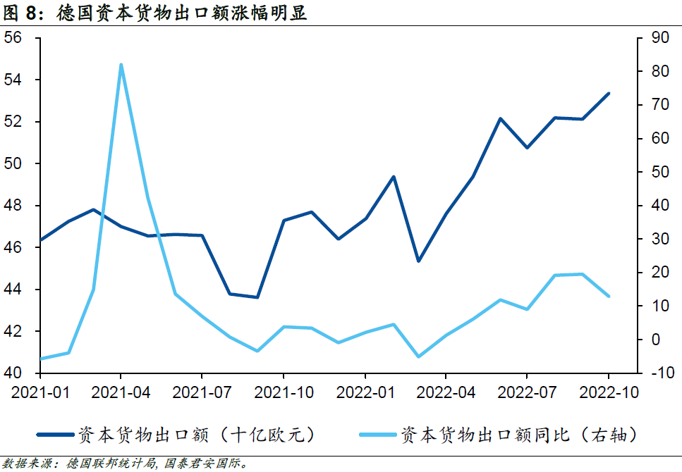 更加重要的是,為了應(yīng)對中長期能源危機(jī),歐盟各國也開始加大對制造業(yè)的支持力度,制定了“能源系統(tǒng)數(shù)字化”計劃,該計劃預(yù)期在2030年前在基礎(chǔ)設(shè)施方面投資5,650億歐元,以大力發(fā)展光伏和新能源汽車產(chǎn)業(yè);除此以外,歐盟還加大了對液化天然氣產(chǎn)業(yè)的投資力度。德國作為歐洲經(jīng)濟(jì)的最重要組成部門,受益于政策支持,其工業(yè)生產(chǎn)并沒有受到太多能源問題的干擾,尤其是核心的資本貨物出口額在衰退預(yù)期的背景下持續(xù)增長。