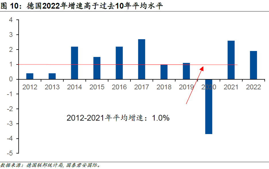 作為歐元區(qū)最大的經(jīng)濟(jì)體,近日公布的數(shù)據(jù)顯示,經(jīng)過價格調(diào)整后,德國2022年GDP同比增長1.9%,高于市場預(yù)期1.8%。不可否認(rèn)的是,俄烏沖突推升的天然氣價格給德國經(jīng)濟(jì)造成了相當(dāng)大的困擾,但是德國2022年GDP依舊增長1.9%,較2019年(新冠疫情開始前一年)高0.7個百分點,亦高于2012年至2021年的十年平均水平(1.0%)。