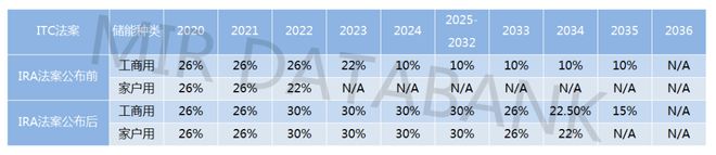 美國IRA法案出臺,獨立儲能納入ITC補貼范圍,并將ITC補貼有效期將持續(xù)到2033年,并將抵免劃分為基礎抵免+額外抵免。其中基礎抵免額度由之前的26%上升至30%,此前為逐年退坡。具體變化情況如下表: