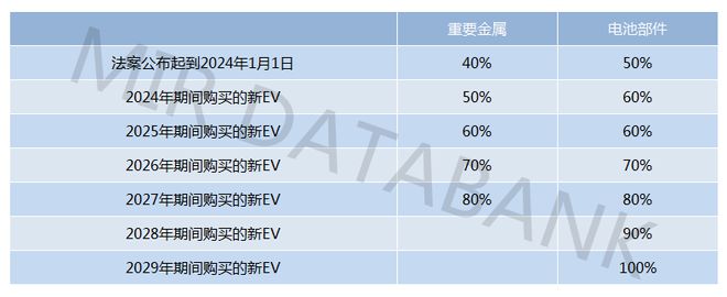 其中電池關鍵礦物原材料國產率部分規(guī)定:可得到補貼的新能源汽車的電池,其包含的適用關鍵礦物*中開采、加工或回收于美國及其自貿伙伴國家*的,需要逐年達到規(guī)定的百分比,否則該部分補貼不可獲得。電池部件國產率部分規(guī)定:電池中在北美制造或組裝的電池組件占整體電池成本的百分比需要逐年達到一定規(guī)定的百分比才能達標,獲得相應部分的補貼。