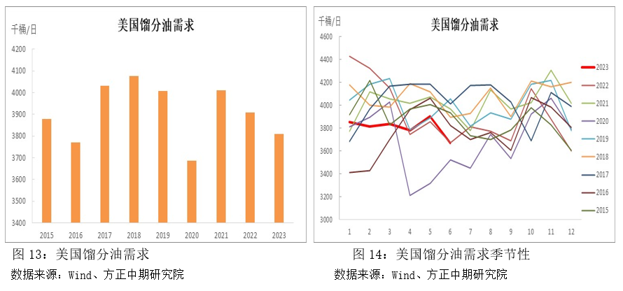 美國(guó)柴油消費(fèi)與美國(guó)制造業(yè)形勢(shì)息息相關(guān),通過對(duì)比發(fā)現(xiàn),美國(guó)餾分油需求與美國(guó)ISM制造業(yè)PMI趨勢(shì)基本保持一致,但存在滯后關(guān)系。其中,2008年金融危機(jī)以及2020年疫情均導(dǎo)致美國(guó)制造業(yè)PMI大幅下滑,并帶動(dòng)美國(guó)餾分油需求明顯走弱,但2021年美國(guó)制造業(yè)再度進(jìn)入下行周期,2022年美國(guó)餾分油需求也開始走弱,2023年美國(guó)餾分油消費(fèi)量達(dá)到381萬桶/日,較2022年下降了10萬桶/日,較2019年下降了26萬桶/日,降幅為6.5%。從歷史數(shù)據(jù)來看,排除極端情況,美國(guó)制造業(yè)變化往往要領(lǐng)先于美國(guó)餾分油需求變化近1年時(shí)間。
