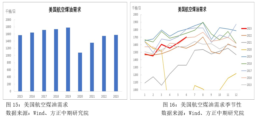 美國(guó)航空煤油消費(fèi)與美國(guó)航空業(yè)景氣度有緊密聯(lián)系。美國(guó)航空股ETF一定程度上能反應(yīng)美國(guó)航空業(yè)景氣度,2020年疫情導(dǎo)致航空出行需求驟降,美國(guó)航空業(yè)遭遇重挫,航空股ETF大幅走跌,相應(yīng)的,美國(guó)航空煤油消費(fèi)也顯著下降,而隨著美國(guó)出行限制的逐步放松,美國(guó)航空業(yè)景氣度也在逐步回升,進(jìn)而帶動(dòng)美國(guó)航空煤油快速回升,但2021年二季度以后,受經(jīng)濟(jì)環(huán)境低迷影響,美國(guó)航空股ETF再度走跌,直至2022年9月份才觸底回升,而在過去1年,美國(guó)航空煤油消費(fèi)整體也隨著美國(guó)航空業(yè)的進(jìn)一步恢復(fù)而走強(qiáng)。另外,我們從OAG的數(shù)據(jù)來看,當(dāng)前美國(guó)航空運(yùn)力已經(jīng)超過2019年同期水平約16%,同時(shí)2023年上半年美國(guó)航空實(shí)際客運(yùn)量也已經(jīng)回到疫情前水平,這對(duì)美國(guó)航空煤油消費(fèi)形成明顯支撐。2023年上半年美國(guó)航空煤油消費(fèi)量達(dá)到158萬桶/日,較2022年小幅增長(zhǎng)了3萬桶/日,但較2019年下降了20萬桶/日,降幅為11%。