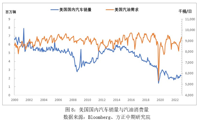 美國(guó)汽油消費(fèi)與美國(guó)汽車保有量及國(guó)內(nèi)汽車銷量的變化有直接關(guān)系,同時(shí)汽車銷售增量相應(yīng)領(lǐng)先于汽油需求增長(zhǎng)。2000年以后,美國(guó)國(guó)內(nèi)汽車銷量呈現(xiàn)明顯的下滑趨勢(shì),至2009年達(dá)到歷史低點(diǎn),此后保持增長(zhǎng)直至2014年,2015年以后美國(guó)汽車銷量再度出現(xiàn)下降,至今仍處在歷史低位水平。相應(yīng)的,美國(guó)汽油需求在2007年以后開始下降,但隨著此后汽車銷量的增加,2012年以后美國(guó)汽油需求再度出現(xiàn)增長(zhǎng),但伴隨著美國(guó)汽車銷量的再度下降,在2017年年中美國(guó)汽油消費(fèi)達(dá)到峰值水平后,開啟了緩慢下降趨勢(shì)。2023年上半年美國(guó)汽油消費(fèi)量達(dá)到884萬桶/日,較2022年小幅增長(zhǎng)了14萬桶/日,但較2019年下降了50萬桶/日,降幅為5%。