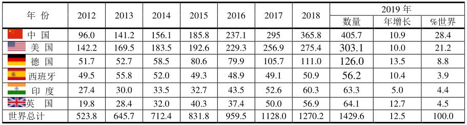 根據(jù)BP 2020年的報告,2019年全球風電場年增長12.5%,發(fā)電量為1429.6TWh,其中發(fā)電量最多的國家是中國,中國于2016年超過美國,2019年增長10.9%,發(fā)電量為405.7 TWh,占全球風電場發(fā)電總量的405.7/1429.6=28.4%。