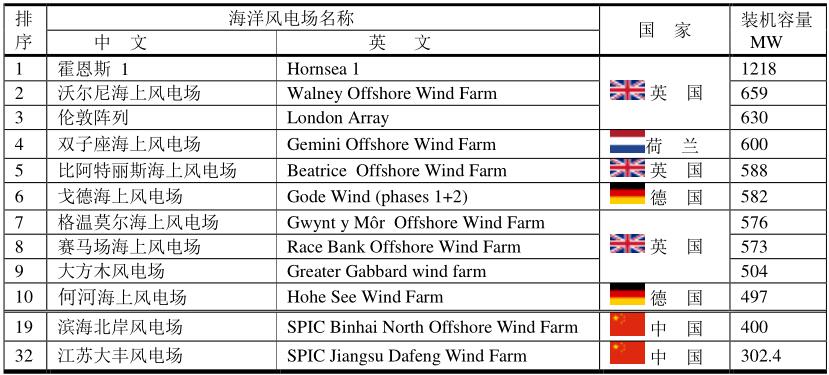 海洋最大的風電場在英國倫敦陣列。中國最大的海上風電場是濱海北岸風電場(SPIC Binhai North Offshore Wind Farm),世界排序19,裝機容量400MW。SPIC是State Power Investment Corporation(國家電力投資公司)的縮寫。