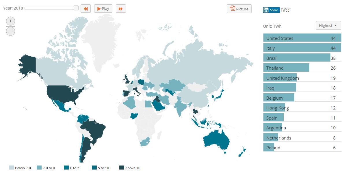 2018年全球電力進口國的貿(mào)易量(單位:TWh)