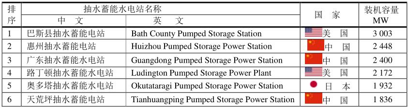 世界上第一座抽水蓄能電站是瑞士于1879年建成的勒頓抽水蓄能電站。當今世界上最大的抽水蓄能電站是美國巴斯康蒂抽水蓄能電站,裝機容量達3003MW,其次為中國惠州抽水蓄能電站,裝機容量為2448 MW,廣東抽水蓄能水電站(Guangdong Pumped Storage Power Station),裝機容量為2400MW。
