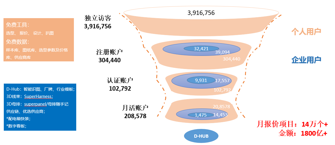 我們既然定下這個(gè)目標(biāo),就要一步一步來(lái)實(shí)施,做云端SaaS服務(wù),把原來(lái)的賣軟件的業(yè)務(wù)變成云服務(wù)。把我們?cè)瓉?lái)的報(bào)價(jià)軟件、設(shè)計(jì)軟件全部云端化并且共享一個(gè)數(shù)據(jù)庫(kù)。我們又做了選型軟件、生產(chǎn)安裝的軟件,目前正在開(kāi)發(fā)數(shù)字看板和數(shù)字工廠,所有的這些產(chǎn)品通過(guò)D-Hub是共享同一套數(shù)據(jù)庫(kù)。我們把原來(lái)離線的產(chǎn)品都變成在線,其中一部分軟件和數(shù)據(jù)免費(fèi)為用戶服務(wù),這些免費(fèi)的軟件和內(nèi)容吸引了大量的用戶,現(xiàn)在我們的獨(dú)立訪客有390萬(wàn)。當(dāng)然我們也有收費(fèi)的產(chǎn)品D-Hub。利馳已經(jīng)從一家CAD軟件公司轉(zhuǎn)變?yōu)樵诰€服務(wù)公司,我們其中的一個(gè)在線服務(wù)——電氣工程項(xiàng)目報(bào)價(jià)——最新的數(shù)據(jù)顯示一個(gè)月可以報(bào)14萬(wàn)個(gè)項(xiàng)目,總價(jià)值約1800億。