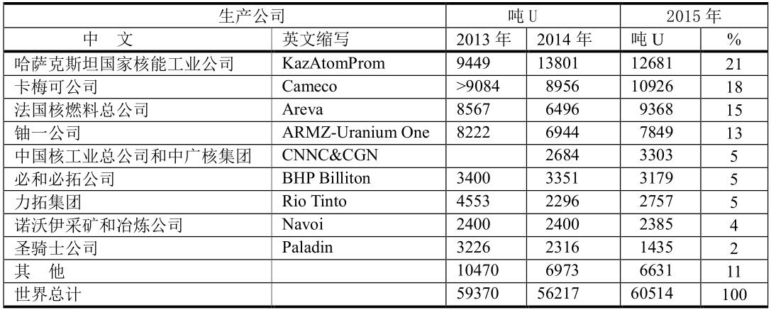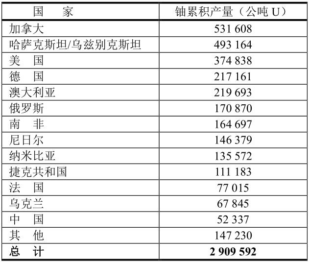 本數據是世界核能協(xié)會(WNA)于 2020年12月份提供的從鈾礦生產(公噸U)的數據。
