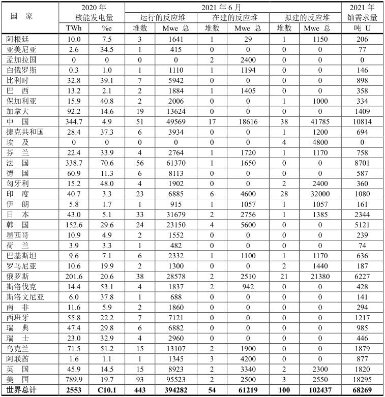 表中“%e”表示核能發(fā)電占發(fā)電總量的百分率。全球核能發(fā)電占全球發(fā)電總量的10.1%,其中法國高達70.6%。本數據是世界核能協(xié)會WNA 2021年1月份提供的數據。