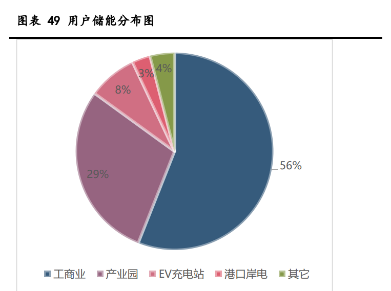 國內(nèi)用戶側(cè)儲(chǔ)能以工商業(yè)和產(chǎn)業(yè)園為主。2021 年國內(nèi)新型儲(chǔ)能中用戶側(cè)儲(chǔ)能占比 達(dá)到 24%,重要性愈發(fā)凸顯,細(xì)分應(yīng)用場(chǎng)景來看,國內(nèi)工商業(yè)和產(chǎn)業(yè)園占據(jù)了絕對(duì)主力, 合計(jì)占比超過 80%,是用戶側(cè)應(yīng)用的主流用途。