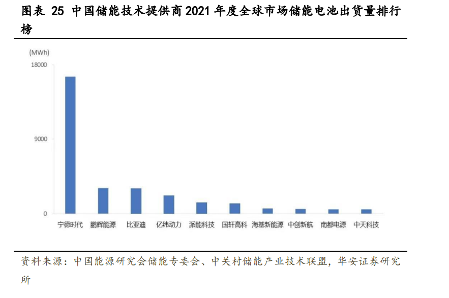 與動力和大儲相比,戶用儲能對電芯技術(shù)的要求相對放寬。戶用場景對電池能量密 度等要求相對較低,影響用戶體驗的主要是產(chǎn)品整體設(shè)計,包括電池管理和全屋能源調(diào) 配等,對電芯性能的要求相對放寬,主要強調(diào)安全性和降本。 封裝路線尚無定型。戶用儲能系統(tǒng)規(guī)模在 10kWh 級別,大圓柱電池(單體容量 10Ah50Ah),方形(50Ah-300Ah),軟包(30Ah-80Ah)方案均有公司選用,目前戶儲采用的 電芯封裝路線并無定型。 小電芯或?qū)⒊蔀閼魞χ髁鳌.?dāng)前歐洲戶儲市場正經(jīng)歷低壓向高壓系統(tǒng)的產(chǎn)品迭代。 高電壓平臺可降低電流,從而控制系統(tǒng)發(fā)熱量,提高放電效率。儲能系統(tǒng)容量不變的情 況下,高壓系統(tǒng)對應(yīng)的電芯容量減小。例如,低壓平臺儲能電芯多為 100Ah,高壓平臺逐 漸向 50Ah 過渡。100Ah 以下小容量電池在戶用家儲領(lǐng)域仍有較長的應(yīng)用生命周期。 目前我國主要儲能電池提供商多為動力電池制造商。根據(jù) GGII 統(tǒng)計,2021 年國內(nèi) 儲能電池出貨量 48GWh,其中電力儲能電池出貨量 29GWh,同比增長 339%;而根據(jù)全球 研究機構(gòu) EVTank 與伊維經(jīng)濟研究院共 2021 年全球儲能電池出貨量 66.3GWh,同比增長 132.6%,電力系統(tǒng)儲能是主要增量貢獻。2021 年,全球市場中,儲能電池出貨量排名前 十位的中國儲能技術(shù)提供商,依次為:寧德時代、鵬輝能源、比亞迪、億緯動力、派能 科技、國軒高科、?;履茉?、中創(chuàng)新航、南都電源和中天科技。